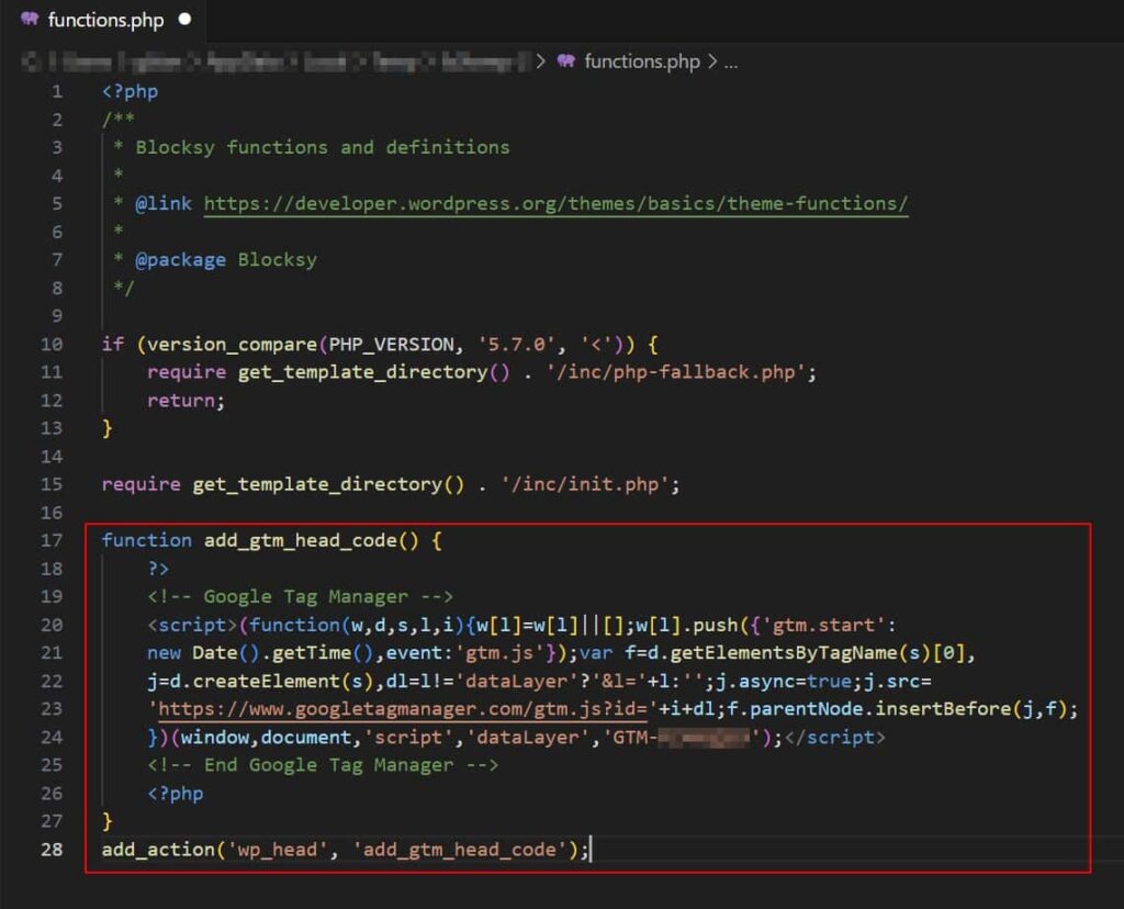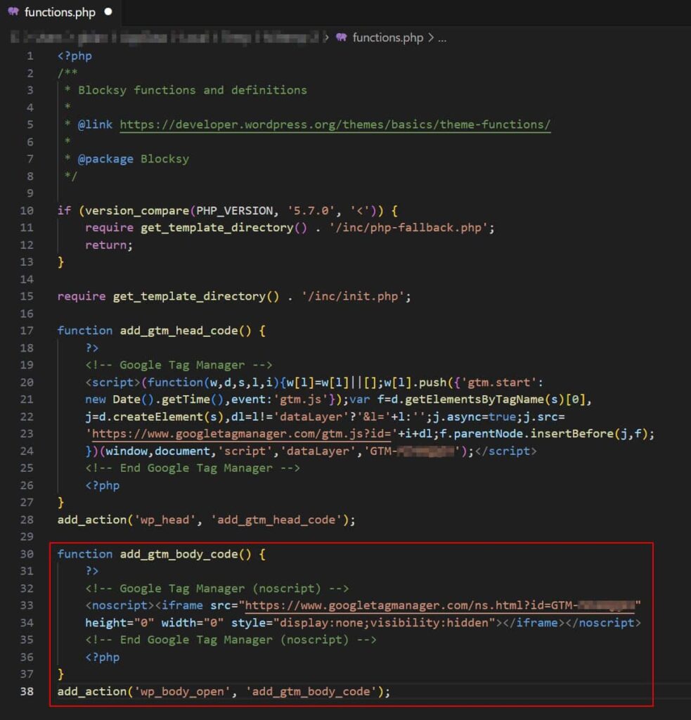 First, you’ll need to get your unique Google Tag Manager (GTM) code snippets and have them ready to paste into your site’s functions.php.
