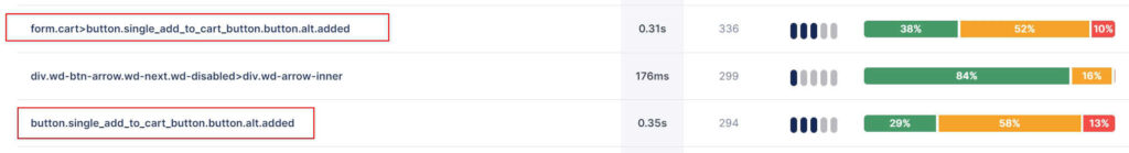 We can see that the interactions with these two elements are mostly in need of improvement. And the selector clearly points to the “Add to Cart” button. Why is that? It turns out that the client has installed a script from Microsoft Clarity on the website that tracks user behavior, and this includes the “Add to cart” button. Every time the customer adds something to the cart, Clarity runs in the background and sends events to Microsoft before the next paint, and all this processing adds up to the INP.