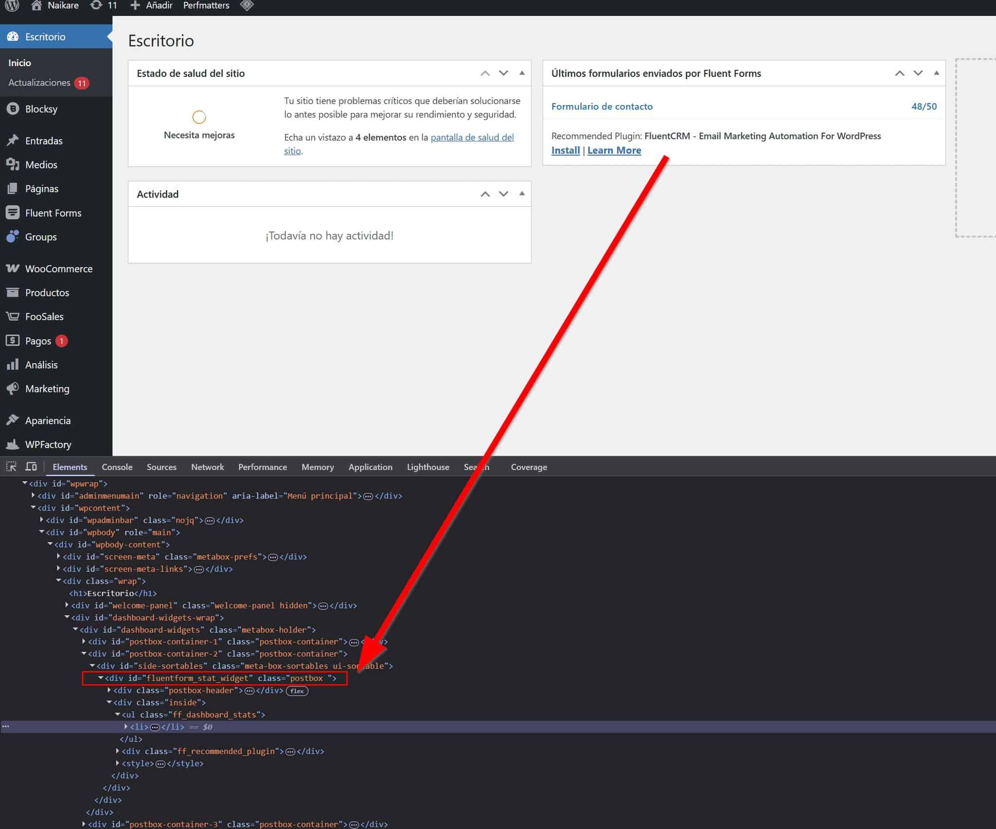 id="dashboard-widgets". For example, for the Fluent Forms widget, the ID isfluentform_stat_widget: